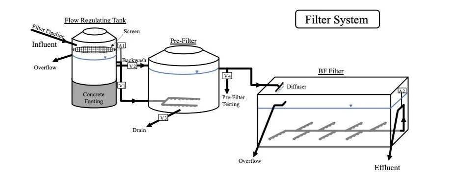 The filtration system consists of a flow regulating tank, ascending flow pre-filter, and 15’ X 20’, descending flow, main filter. The system can run continuously at a flow rate of 7 liters per minute.